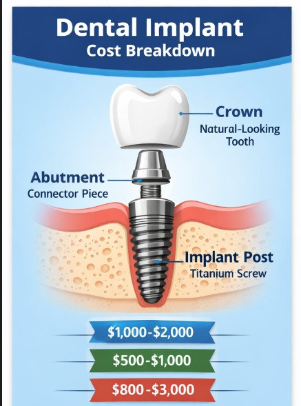 For example, just the implant post itself can cost $1,000 to $2,000, while the crown can cost $1,000 to $3,000 depending on materials used.